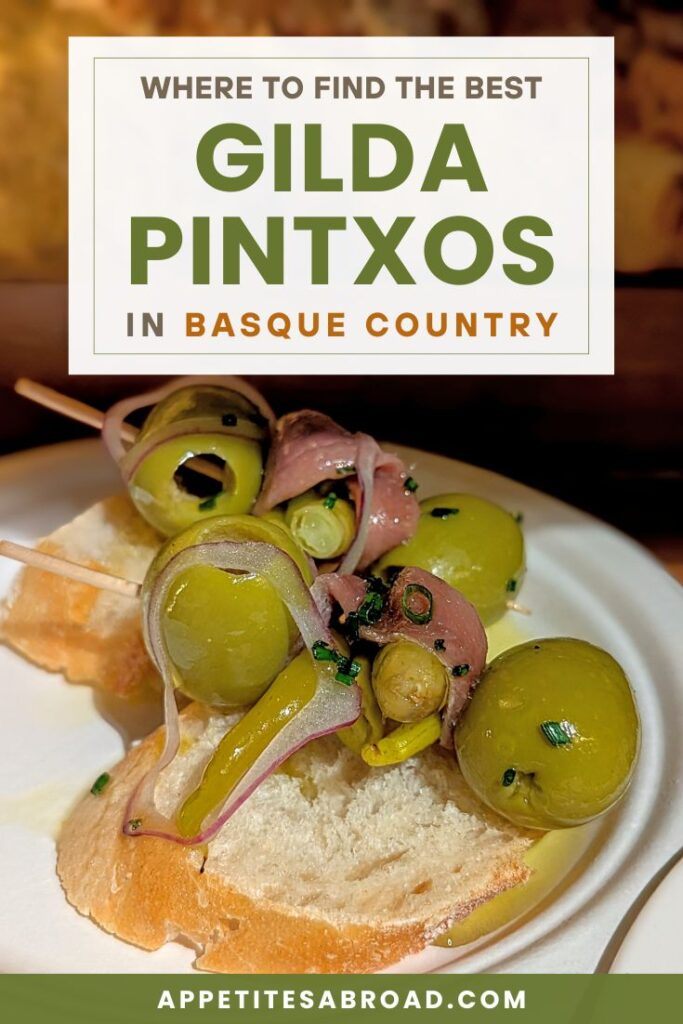 The salty little bar snack called La Gilda quickly became one of our favorite bites in the Basque region of Spain. After our first, we knew we’d need to try as many Gildas as we could!