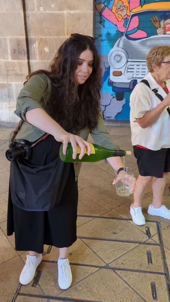 Now, there is a reason that we did this activity outside of the restaurant. Basque cider gets poured from a height way above the glass to aerate and release its flavors. It is an art, and unless you have a knack for it, spills will happen (as in my case).