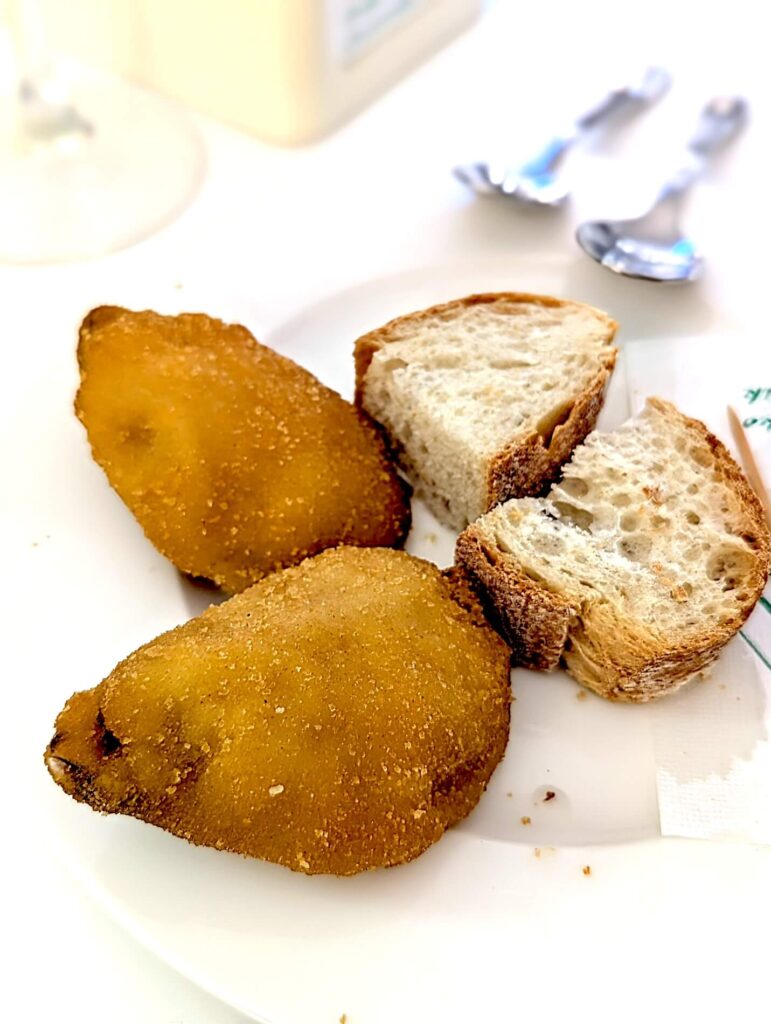 Here’s a dish that surprised me and was one I never would have thought to order on my own: mejillones tigres. These are cooked mussels that are chopped up and mixed with onions, tomato, and paprika with a thick bechamel. This all gets stuffed into half a mussel shell and is then breaded and fried.