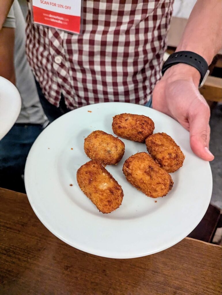 Some amazing things we got to eat and drink (some of which I’ll mention in this guide as their own separate foodie experiences) include vermouth, fried bacalao, chorizo-stuffed mushrooms, croquettas, and the most delicious gambas al ajillo!