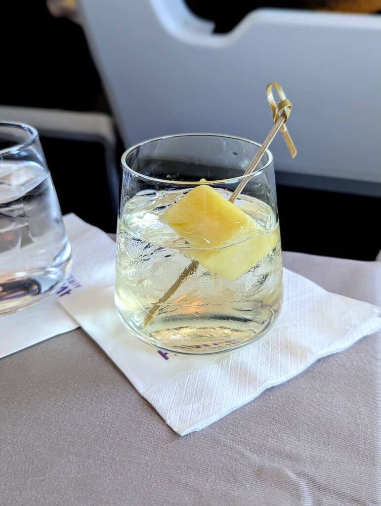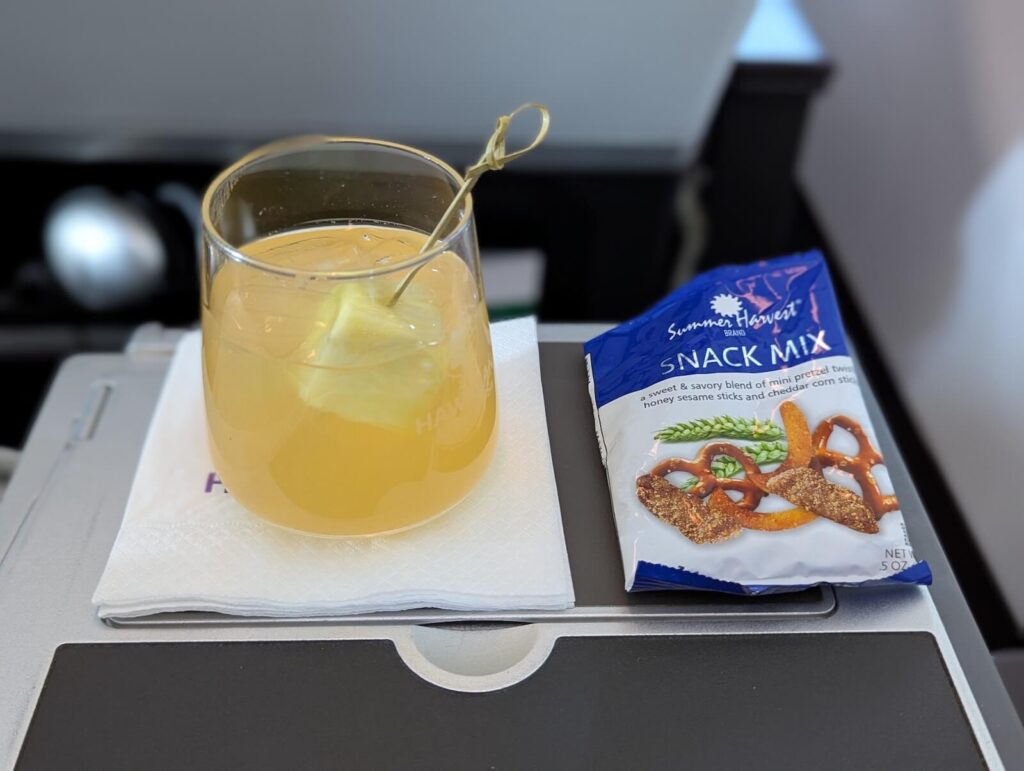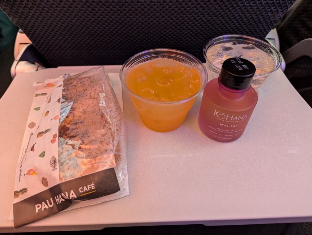 Once in the air, we got another drink to have with a little bowl of macadamia nuts and subsequent breakfast. I ordered a Mai Tai but I got what I think was the Pineapple Daiquiri instead (a pre-mixed drink by the Ko Hana Rum brand). It was actually delicious and refreshing with a fresh chunk of pineapple as a garnish!