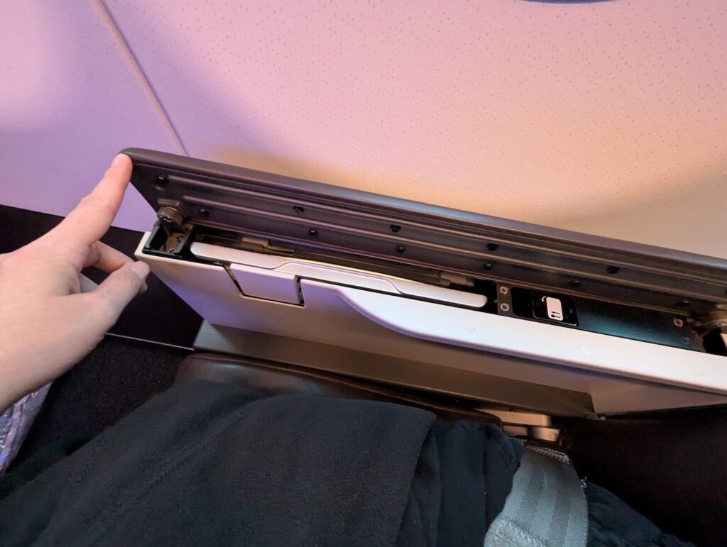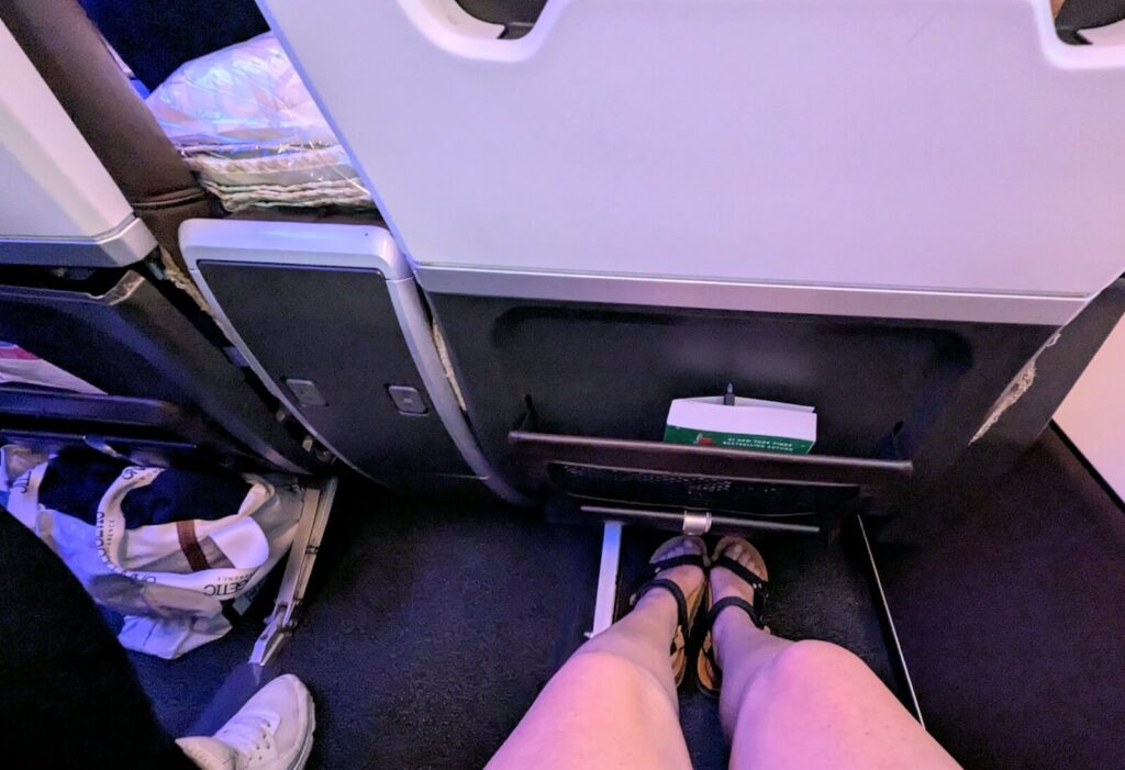 The under-seat storage is extremely tight, which I had already anticipated, having read about this previously. I took a few things out of my bag quickly that I’d need for the flight and just chucked my backpack in the overhead bin. I was glad to have the space for my feet to stretch into instead anyway. If you have a smaller purse, you’ll be fine.