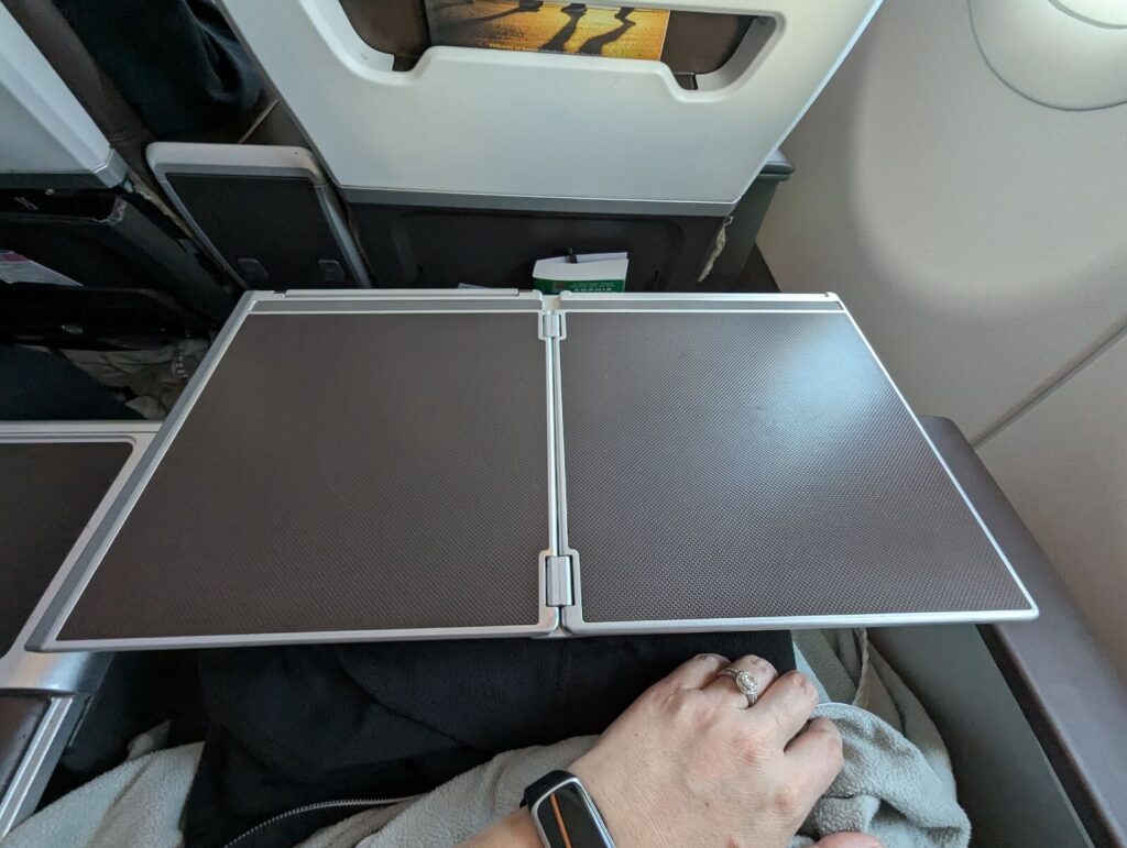 The tray tables for these seats come out of the armrest and are big enough for meal service and to fit your laptop or iPad for entertainment.