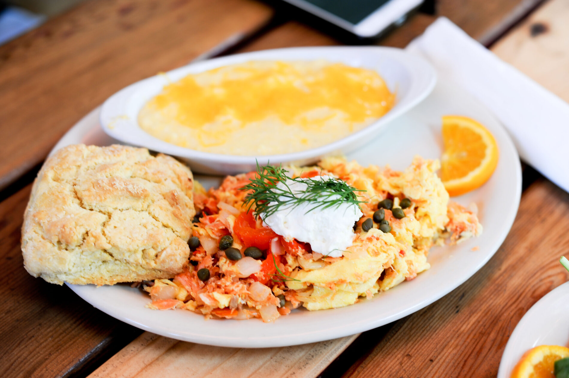 When we visited, my husband got a gigantic sausage and egg sandwich and a side of their creamy cheddar grits. It was delicious and super filling!