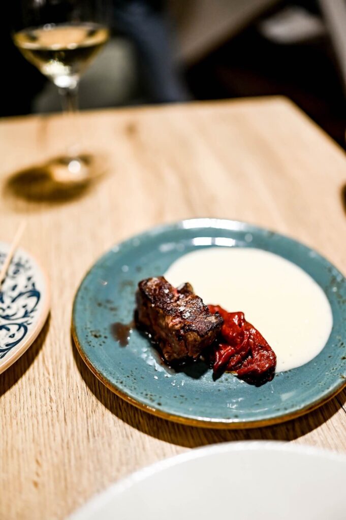 One of Ali’s recs was the foie gras – an ingredient that tends to be a popular addition to dishes in the Basque Country. Here, it’s served with green applesauce, muscatel, and walnuts. It was incredibly rich but balanced with the tangy puree and muscatel wine sauce. Also, thank goodness for the bread to cut through that richness!